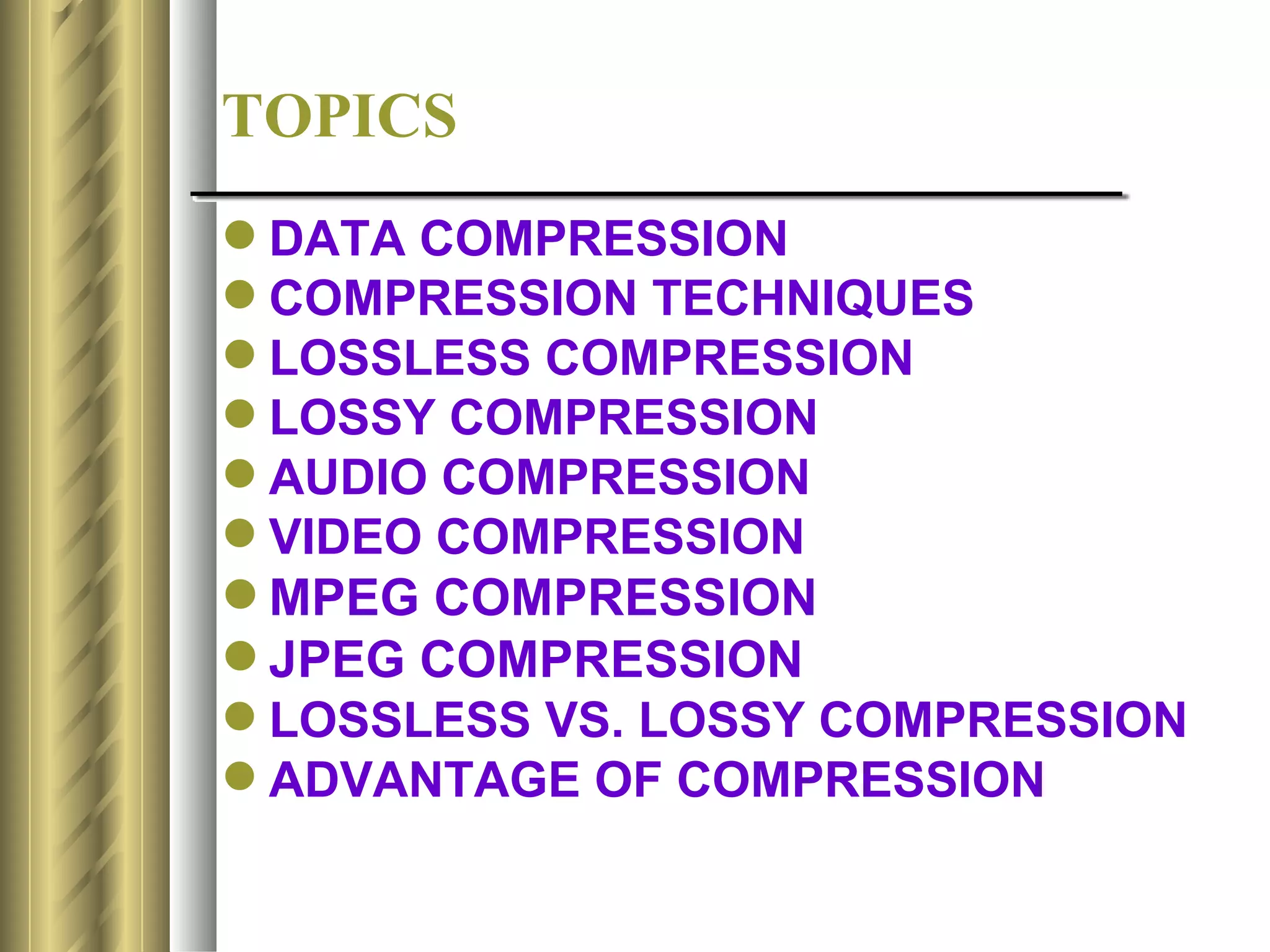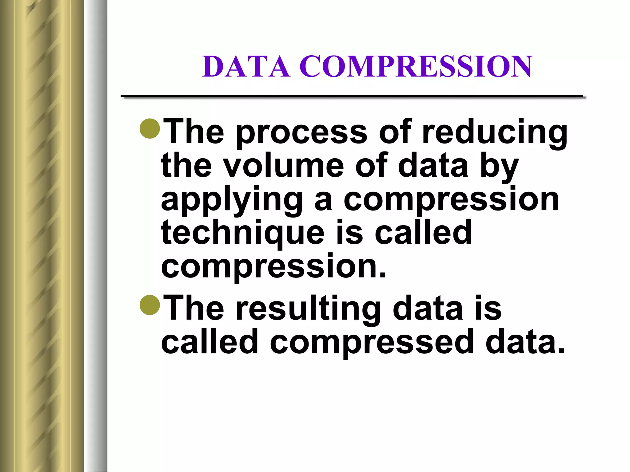 This document discusses various topics related to data compression including compression techniques, audio compression, video compression, and standards like MPEG and JPEG. It covers lossless versus lossy compression, explaining that lossy compression can achieve much higher levels of compression but results in some loss of quality, while lossless compression maintains the original quality. The advantages of data compression include reducing file sizes, saving storage space and bandwidth.