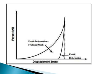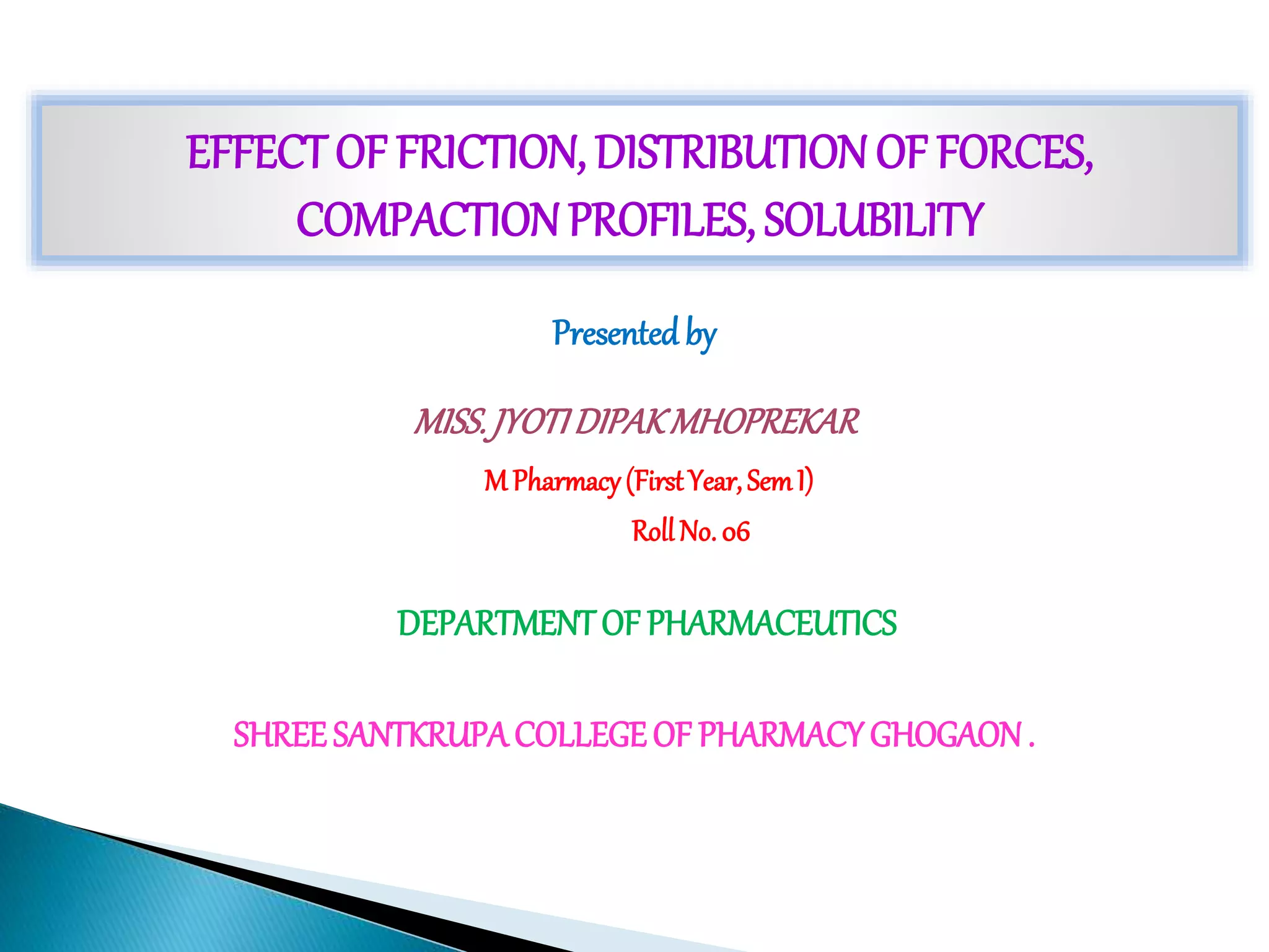 The document discusses the effects of friction, distribution of forces, compaction profiles, and solubility in pharmaceutical tableting. It describes the various forces involved including frictional, distributional, radial, and ejection forces. It explains how friction affects particle rearrangement and die wall movement. It discusses how forces are distributed and measured, including average and geometric mean forces. It outlines compression and decompression phases in compaction profiles and how they are analyzed. It also addresses the importance of solubility for drug bioavailability and therapeutic effectiveness.