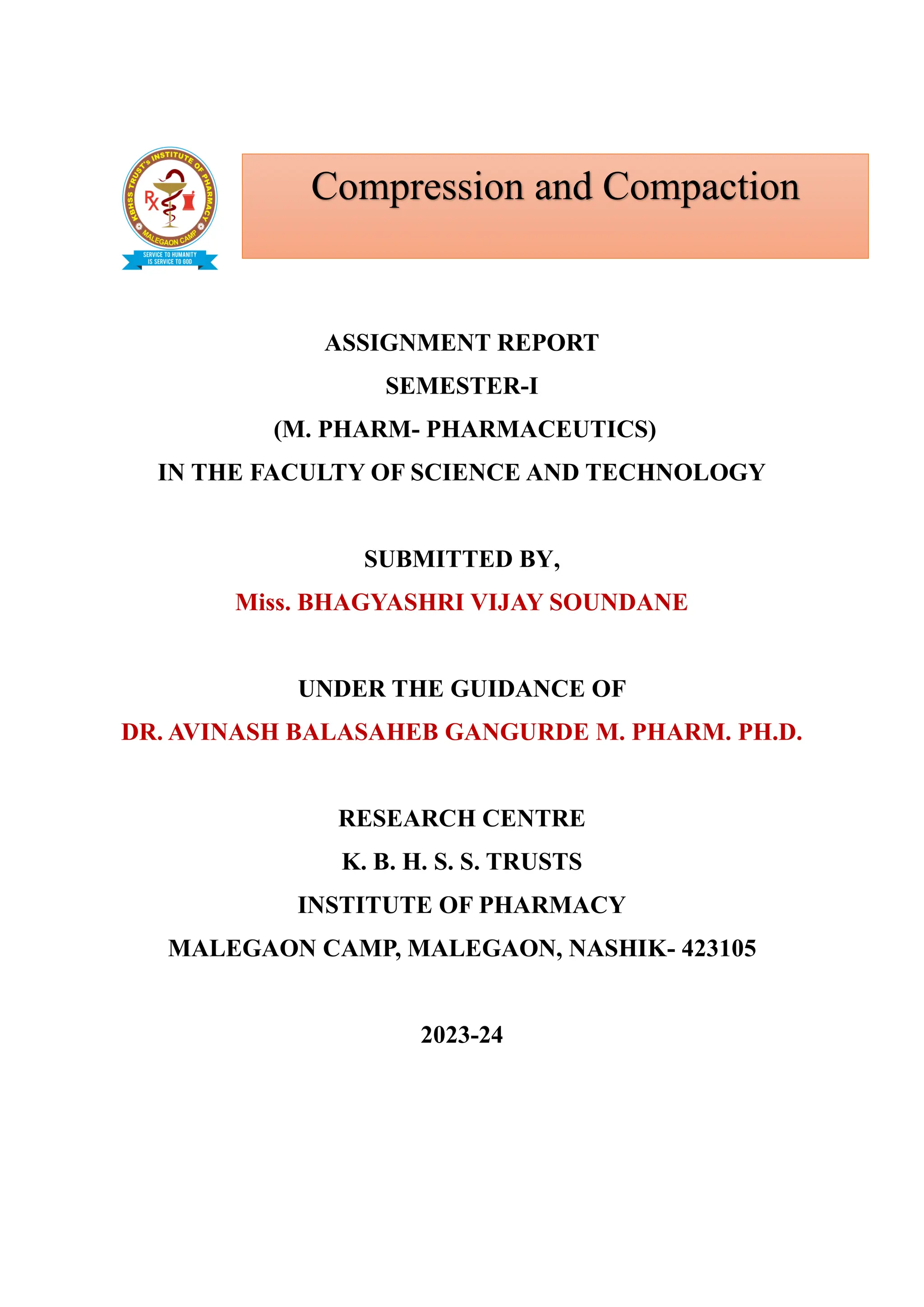 The document is an assignment report detailing the processes of compression and consolidation in tablet formulation within pharmaceutical sciences. It outlines the mechanics and physics of tablet compression, including definitions, steps involved, and the effects of forces during the compaction process. Key topics include particle rearrangement, deformation, bonding theories, and the impact of friction on tablet production, emphasizing the significance of powder properties in achieving the desired tablet quality.