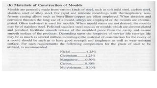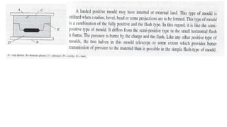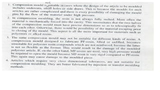 This document discusses different types of transfer moulds used in compression moulding processes, including pot type transfer moulds, plunger or auxiliary ram type transfer moulds, loose plate or hand transfer moulds, and integral or accordion type transfer moulds. Transfer moulds are used to move preheated material from a compression mould to subsequent moulds for further compression and shaping.