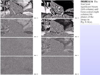 The document discusses various techniques for image compression, including lossless and lossy methods. For lossless compression, it describes predictive coding techniques that remove inter-pixel redundancy such as delta modulation. It also covers entropy encoding schemes like Huffman coding and LZW coding. For lossy compression, it discusses the discrete cosine transform used in the JPEG standard, where higher frequency coefficients are quantized more coarsely to remove information. Zig-zag ordering is used before entropy coding the quantized DCT coefficients.