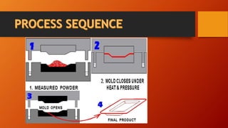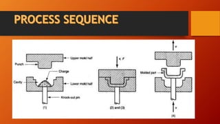 (2) The process involves preheating the molding material, placing it into the mold, applying pressure using a hydraulic press, and allowing the material to cure.