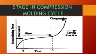 (1) Compression molding is a manufacturing process used to mold thermosetting materials under heat and pressure in a mold cavity.