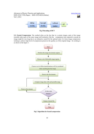 This document summarizes and compares different image compression techniques, including DCT, fractal compression, and their applications in steganography. It discusses how DCT works by transforming image data into frequency domains, while fractal compression exploits self-similarity within images. The document reviews several existing studies on combining these techniques with steganography and encryption. Specifically, it examines approaches that use DCT and fractal compression to improve data hiding capacity and security. Overall, the document provides an overview of key compression algorithms and their applications in digital watermarking and steganography.