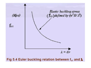 1) The document discusses the design of compression members and buckling behavior. It covers topics like Euler buckling analysis, factors that affect column strength, and modern design using column curves.