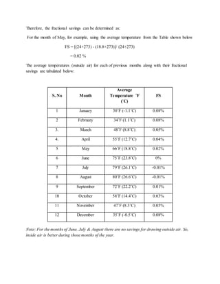 The document discusses the installation of ducting to redirect outside air to the intake of compressors to improve efficiency, particularly during colder months when outside air is cooler than inside air. Utilizing outside air can yield energy savings and reduce operational costs, with substantial savings evident from September to May. The total installation cost is estimated at $4,700, with a payback period of approximately 1.55 years based on calculated energy and cost savings.