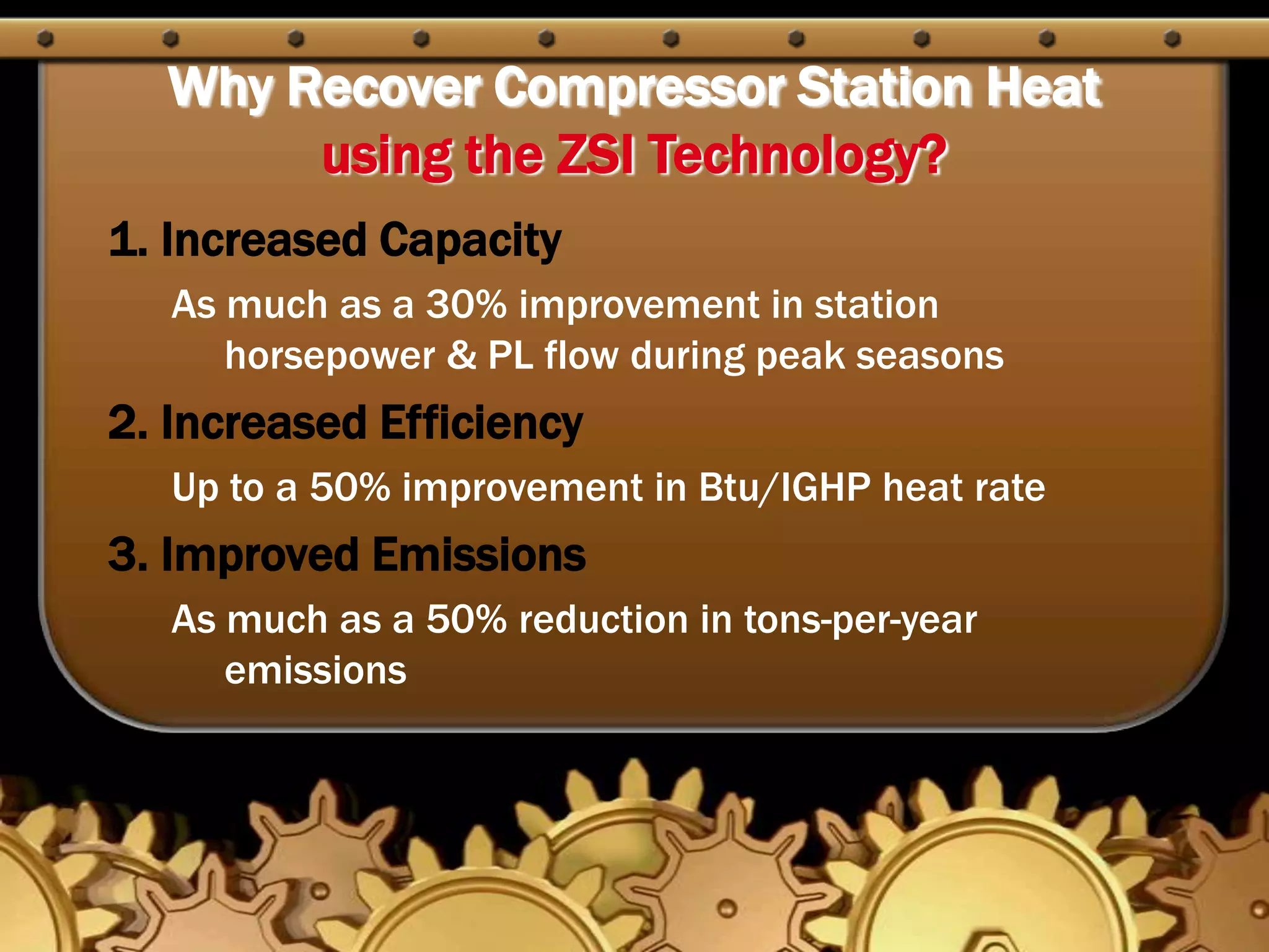 The document discusses Zero Stage Inc.'s technology for recovering heat from compressor stations to improve capacity, efficiency, and reduce emissions. The Zero Stage solution uses recovered exhaust energy to pressurize inlet air, making gas turbines more powerful and efficient while lowering emissions. This allows existing engines to continuously operate at their lowest emission point. Testing showed the system can increase capacity by 50% and lower emissions by as much as 40% without requiring electricity generation equipment. The solution provides economic and environmental benefits to pipeline operators.