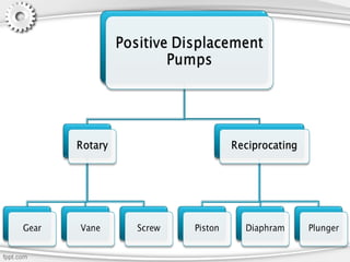 - Positive displacement pumps like gear pumps, vane pumps, piston pumps, and diaphragm pumps.