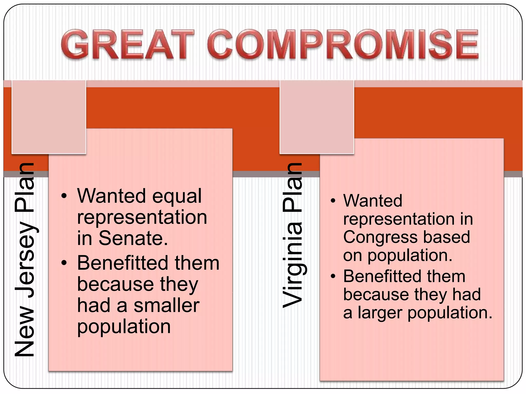 The New Jersey Plan proposed two houses of Congress, with equal representation for each state in the Senate, and representation in the House based on population. It also proposed that slaves count as 3/5 of a person for determining populations. The North and South compromised on these points to avoid splitting the new fragile country. However, tensions continued over issues like tariffs and the expansion of slavery. Later compromises failed to resolve the fundamental differences between the regions and the country headed towards civil war.