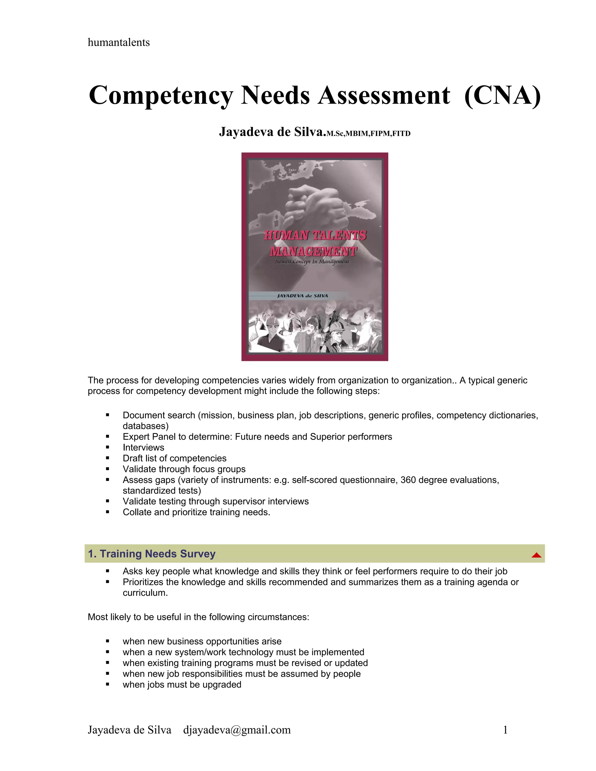 The document discusses competency needs assessment (CNA) and various methods for conducting a training needs analysis (TNA). It describes four common TNA methods: 1) training needs surveys that ask key people what skills are needed, 2) competency studies that determine required competencies, 3) task analysis that identifies tasks and skills for jobs, and 4) performance analysis that links skills to job performance. Each method has advantages and disadvantages depending on the organization's needs and circumstances. Conducting a TNA is important to identify skill gaps and prioritize training to meet business and job requirements.