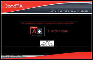 Thomas C Honeycutt received a CompTIA certification with the code DVJLE8TLDCBQC9BD. The certification was issued on August 19, 2009. He can verify this certification online at http://verify.CompTIA.org.