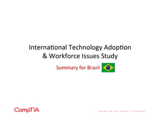 This document provides a summary of key findings from a study on technology adoption and workforce issues in Brazil. The study surveyed over 1,000 IT and business executives across 10 countries. In Brazil, priorities for businesses included IT security, data storage/backup, and network infrastructure. While most Brazilian executives expect growing business conditions in 2013, many also anticipate increasing IT staff and spending. The study found gaps in certain IT skills at most Brazilian businesses, with common negative effects being lower productivity and suboptimal customer service. Cybersecurity threats were also seen as increasing, with human error viewed as a contributing factor.