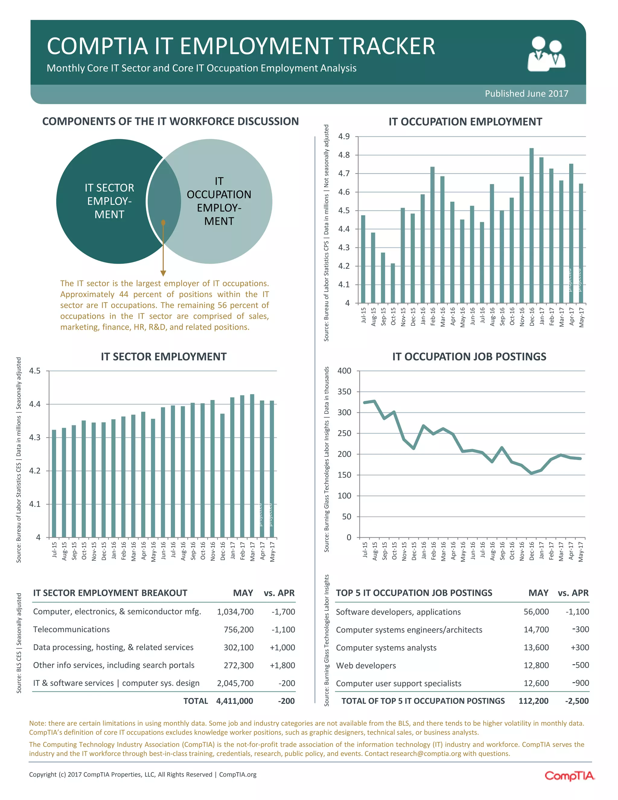 The document analyzes employment data for the IT sector and core IT occupations from July 2015 to May 2017. It finds that total IT sector employment in May 2017 was 4.411 million, down slightly from April, while IT occupation employment was 1.957 million, also down slightly month-over-month. The top 5 IT occupations by job postings in May were software developers, computer systems engineers, computer systems analysts, web developers, and computer user support specialists, though all saw declines in postings compared to April.