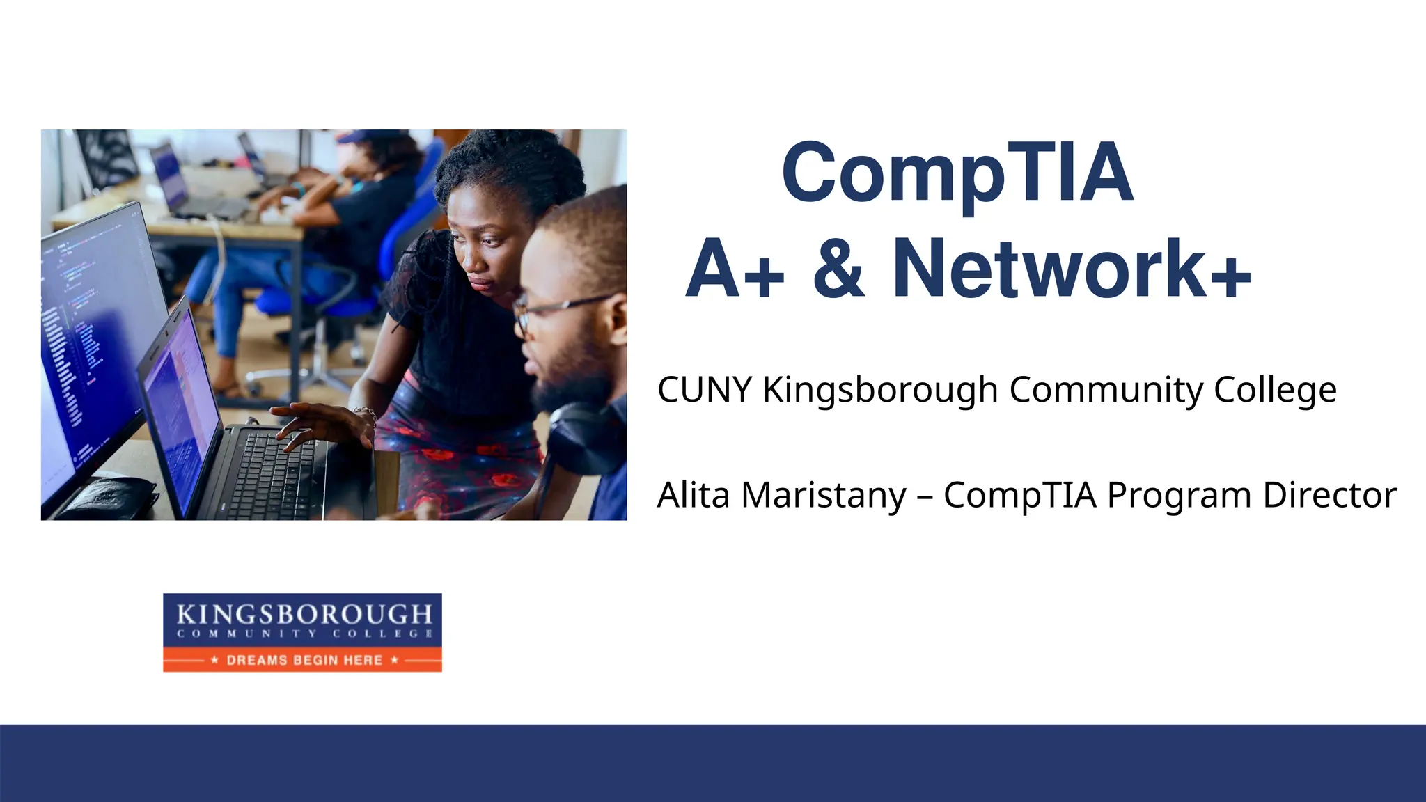 The CompTIA program at CUNY Kingsborough Community College offers free online training to prepare students for the CompTIA certification exams, aimed at becoming a computer support technician. The program includes a curriculum for both A+ and Network+ certifications, covering topics such as PC hardware, software, networking, and security, alongside internship opportunities. Eligibility requires participants to be 18 years or older, have a high school diploma, and possess basic computer knowledge and internet access.