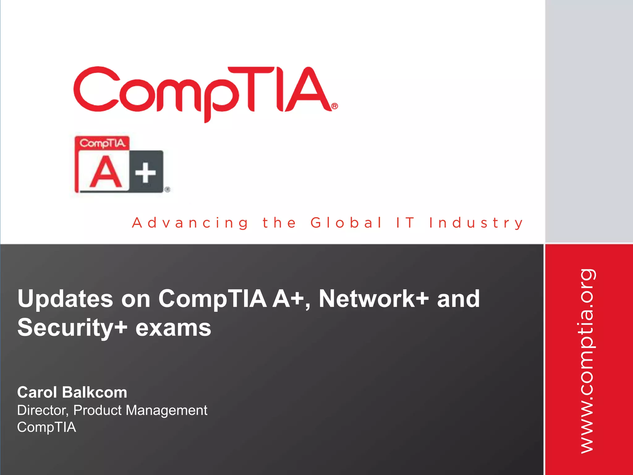 This document summarizes updates to CompTIA A+, Network+, and Security+ certification exams. It discusses the addition of performance-based questions to these exams starting in late 2012/early 2013. These will involve simulated environments to test hands-on troubleshooting skills, and will reduce the number of multiple choice questions. The goal is for the exams to better measure practical skills required for IT jobs.