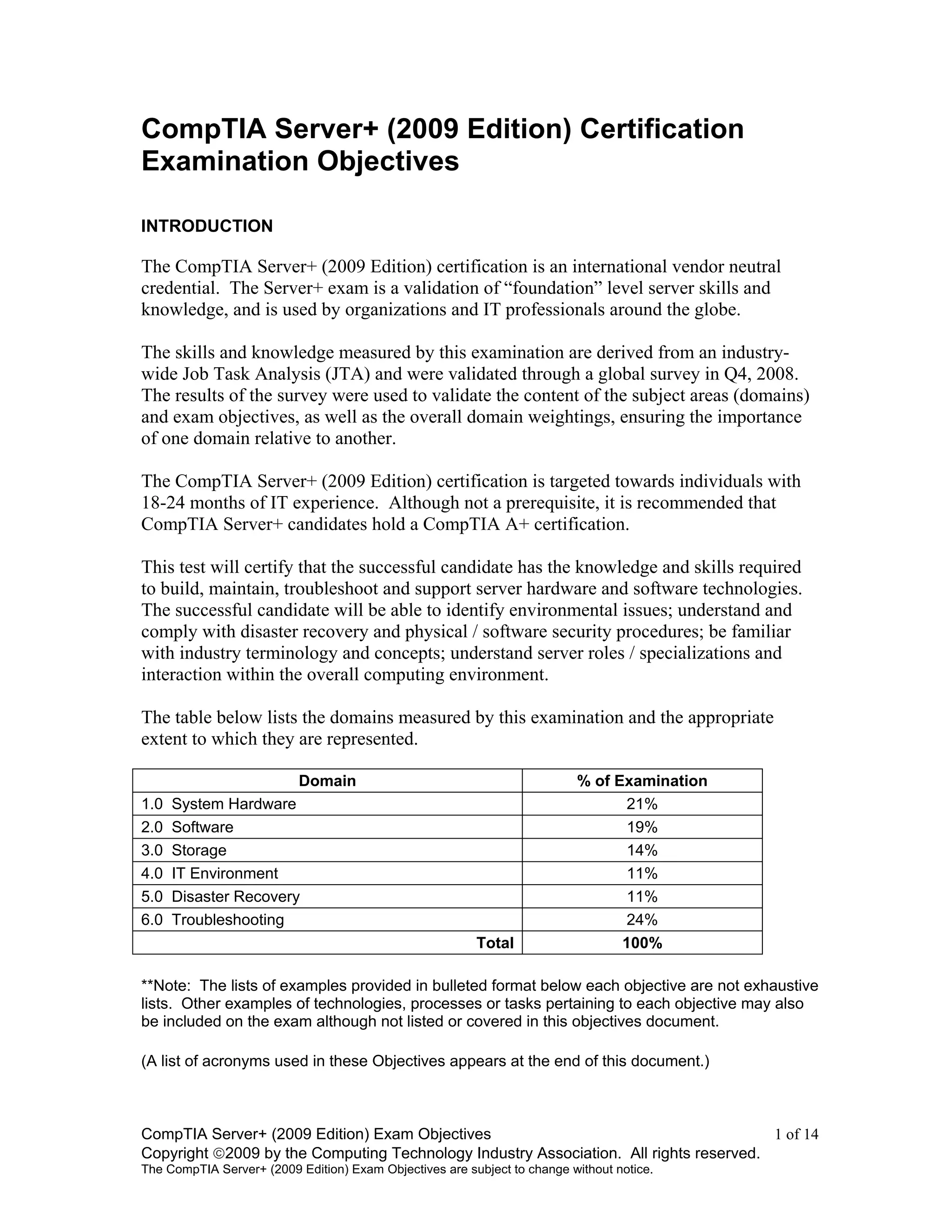 The document provides an introduction and overview of the CompTIA Server+ (2009 Edition) certification exam, including the domains and topics covered on the exam. It describes the exam's focus on foundational server skills and knowledge. It also lists the six domains that are measured on the exam and the percentage of the exam dedicated to each domain, which include system hardware, software, storage, IT environment, disaster recovery, and troubleshooting.