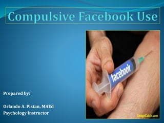 The document discusses Facebook addiction, which refers to excessive and compulsive Facebook use that leads to negative personal outcomes. While excessive use is not necessarily addictive, studies have focused on Facebook addiction given its popularity. Facebook addiction is characterized by preoccupation, progression of use, perceived loss of control, persistence despite negative consequences, and overuse in various areas like checking, reporting, commenting, and concern for one's image. Factors that may contribute to addiction include fear of missing out, compensating for shyness, and relying on it for social validation. The document outlines signs of addiction and provides recommendations for admitting addiction, reducing use, finding real-life alternatives, and seeking therapy.