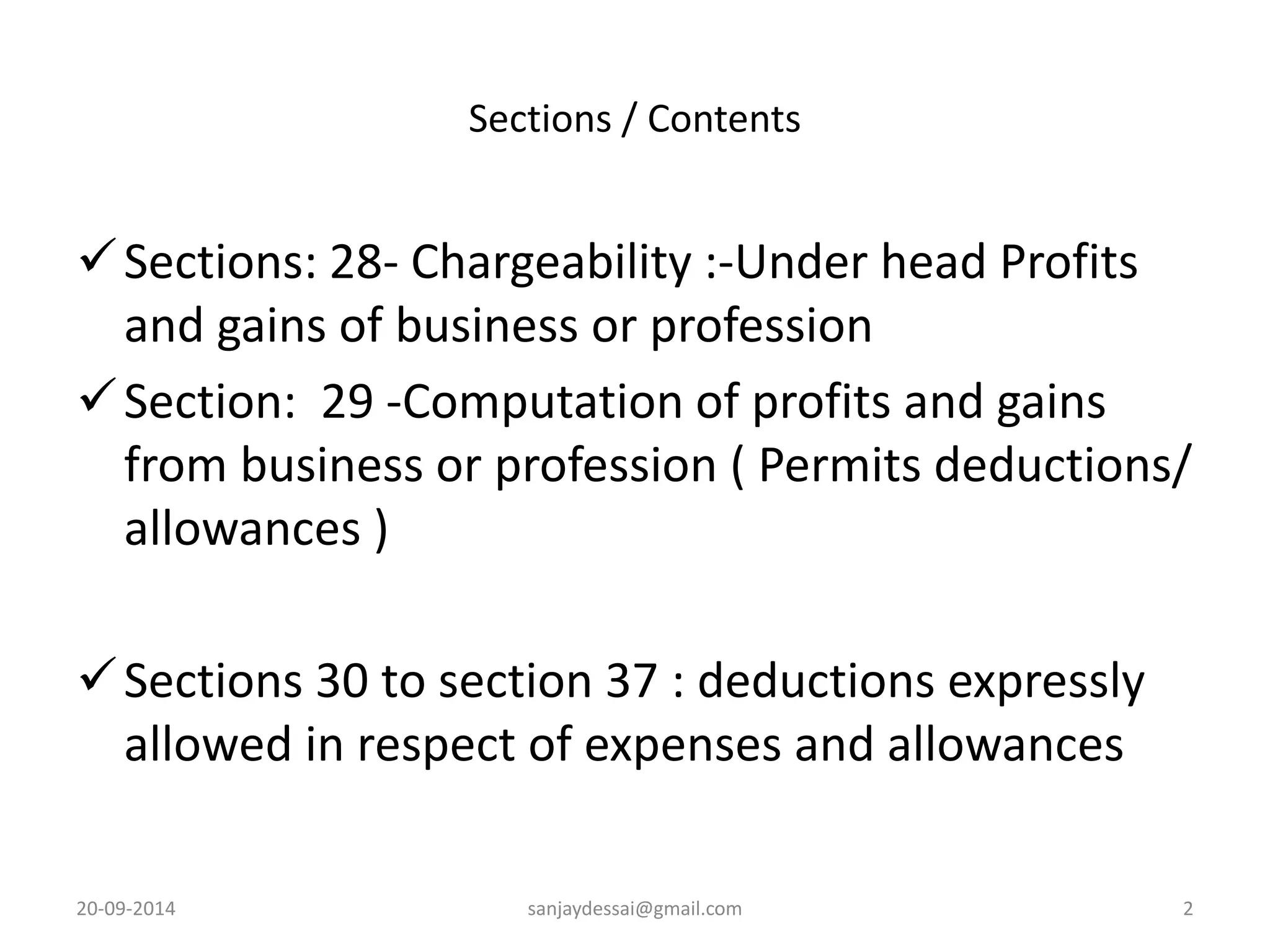 The document provides an overview of the computation of profits and gains of business or profession relevant for B.Com (Taxation) students at Goa University, including key sections of the Income Tax Act. It covers aspects such as chargeability, allowable deductions, methods of accounting, and specific provisions for maintaining books of accounts and audits. Additionally, particular attention is given to expenses that are not deductible and the criteria for different taxation scenarios.