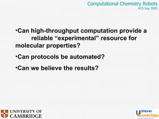 This document discusses the automation of computational chemistry calculations and protocols to reliably generate molecular property data. It addresses validating computational methods, analyzing results for errors and outliers, and comparing output to experimental data. The goal is to provide high-quality "experimental" data through automated high-throughput computation while ensuring valid results and identifying unusual computations. Workflows, parsing tools, and dissemination methods are presented for managing large numbers of jobs and analyzing results.