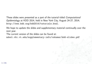 It discusses the history and basic concepts of computational epidemiology, from early mathematical models of diseases like smallpox and cholera to modern networked and data-driven approaches. Computational epidemiology uses mathematical and computational methods to study disease transmission and inform public health responses to epidemics. The field aims to attract computing and data scientists to help address open problems through frameworks like graphical dynamical systems.