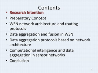 The document discusses computational intelligence based data aggregation techniques in wireless sensor networks. It begins by introducing the research intentions of integrating computational intelligence techniques with conventional data aggregation to improve efficiency. It then provides background on wireless sensor network architectures, routing protocols, and challenges with data aggregation. Finally, it proposes using techniques like neural networks, genetic algorithms, fuzzy logic, and particle swarm optimization to enable adaptive and distributed data aggregation and fusion in sensor networks.