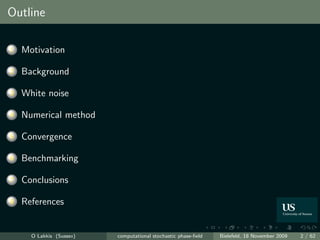 The document discusses computational aspects of stochastic phase-field models. It begins by motivating the inclusion of thermal noise in phase-field simulations through examples of dendrite formation. It then provides background on the deterministic phase-field and Allen-Cahn models before introducing the stochastic Allen-Cahn equation with additive white noise. The remainder of the document discusses the importance of studying this problem both theoretically and computationally, as well as outlining the topics to be covered in more depth.