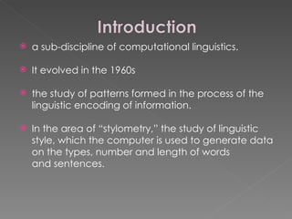 Computational stylistics is a sub-discipline of computational linguistics that analyzes linguistic patterns and styles through the use of computers. Stylistic analysis can detect unique characteristics in an author's linguistic patterns and style, distinguishing one author from another. Studies in this field examine the frequencies of common words used in different texts to investigate resemblances and differences between texts.