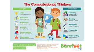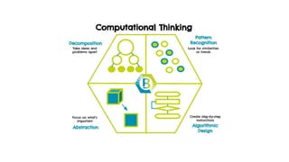 This document discusses computational thinking and provides examples of how it can be applied. It defines computational thinking as using logical reasoning and problem-solving skills to solve problems. It gives examples of computational thinking in everyday life, sciences, archaeology, journalism, and more. The document also discusses teaching computational thinking to others using block-based programming languages like Snap, Scratch, and Pictoblox. Key concepts covered include sequences, loops, conditionals, events, parallelism, operators, and data.