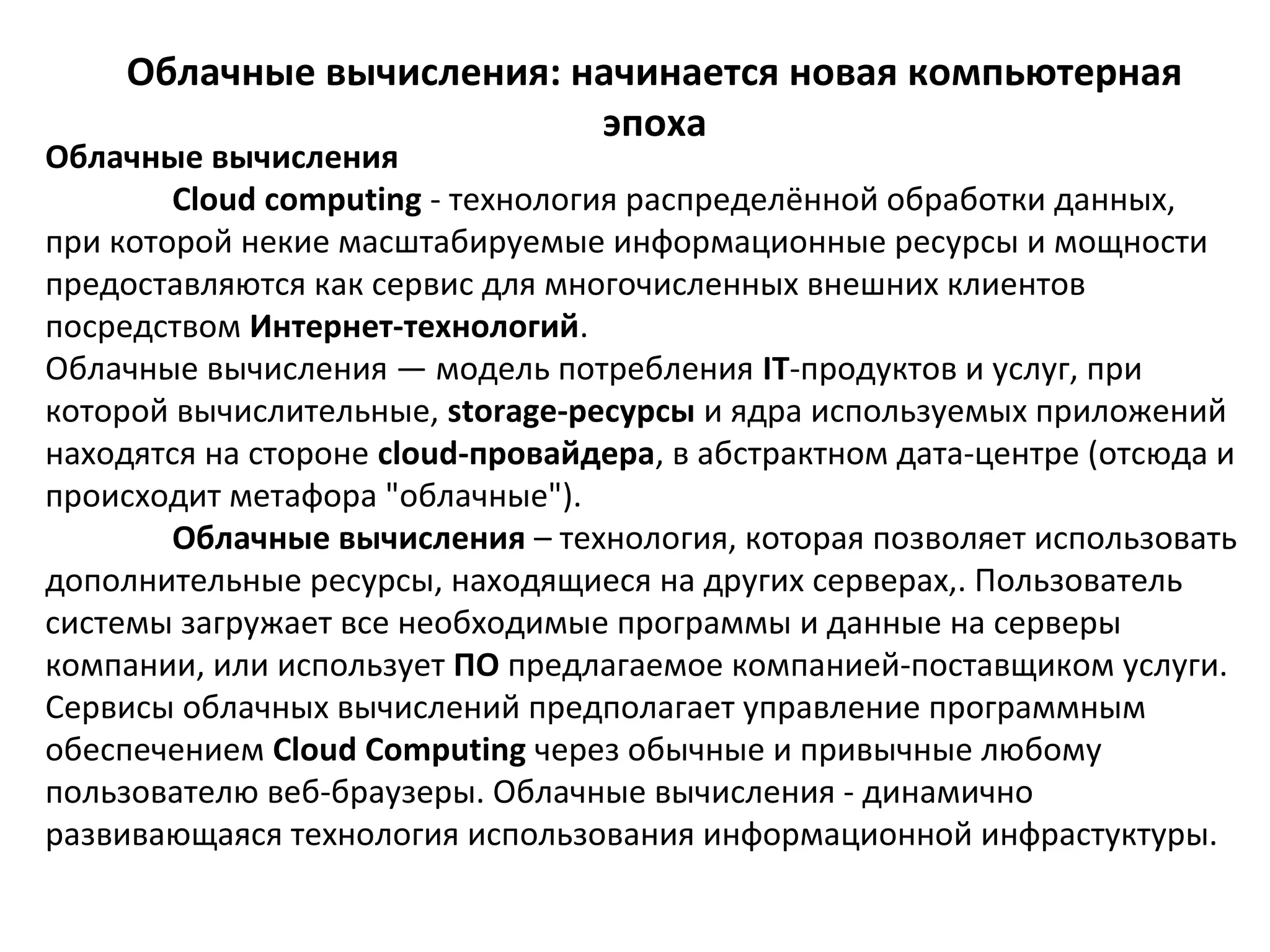 Облачные вычисления представляют собой модель распределённой обработки данных, позволяющую пользователям арендовать вычислительные мощности через интернет. Эта технология обеспечивает оптимизацию ресурсов, экономию затрат и повышение безопасности данных при управлении IT-услугами. В России наблюдается растущий интерес к облачным решениям, однако их внедрение пока сдерживается недопониманием и осторожностью со стороны пользователей.