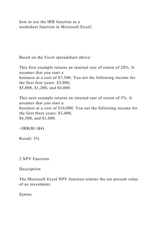 The document explains how to calculate Internal Rate of Return (IRR) and Net Present Value (NPV) using Microsoft Excel functions, detailing their syntax and parameters. It highlights essential considerations in capital budgeting, such as cash flows versus accounting profits, financing costs, working capital, and cash flow estimation methods. Additionally, real-world examples, including a case study on Speedo's LZR-2 swimsuit project, illustrate these concepts in a practical context.