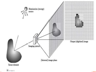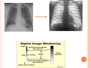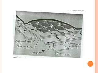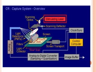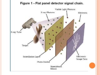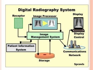 This document provides an overview of digital radiography, including its history and key components. Digital radiography converts analog X-ray images to digital files using various detection methods. These include computed radiography using photostimulable phosphor plates, as well as direct digital radiography techniques like CCD and flat panel detectors that directly capture X-ray data without image plates. The digital files then undergo processing to enhance image quality and enable analysis.