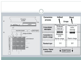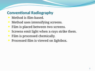 The document provides an overview of conventional radiography, computed radiography (CR), and direct digital radiography (DR). It explains the processes and technologies involved in each method, highlighting the limitations and advantages of film-based systems compared to digital methods. CR and DR enable electronic image manipulation and improved efficiency in medical imaging.