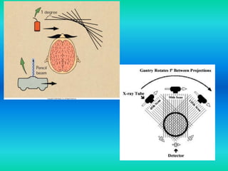 - The document discusses the five generations of computed tomography (CT) scanners since 1970 and how each generation improved scan time and image quality/resolution. First generation scanners took 5 minutes for a single slice while current scanners can acquire a full scan in under 1 second.