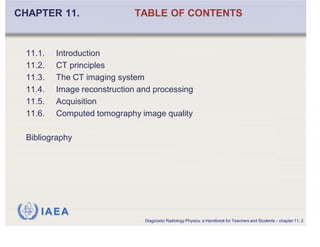 This document is a 190 slide summary of Chapter 11 from the IAEA publication "Diagnostic Radiology Physics: A Handbook for Teachers and Students". The chapter discusses Computed Tomography (CT) scanning principles, including how CT was initially used for brain imaging in 1971 and has since become a versatile 3D whole body imaging technique used in various medical applications such as oncology, cardiology, and interventional radiology. It also describes how CT is used for diagnosis, treatment planning, and screening and mentions specialized CT applications for radiotherapy planning and multi-modality imaging with PET/CT or SPECT/CT systems.