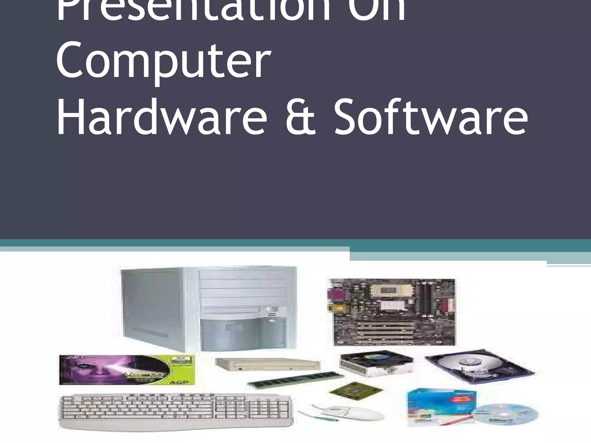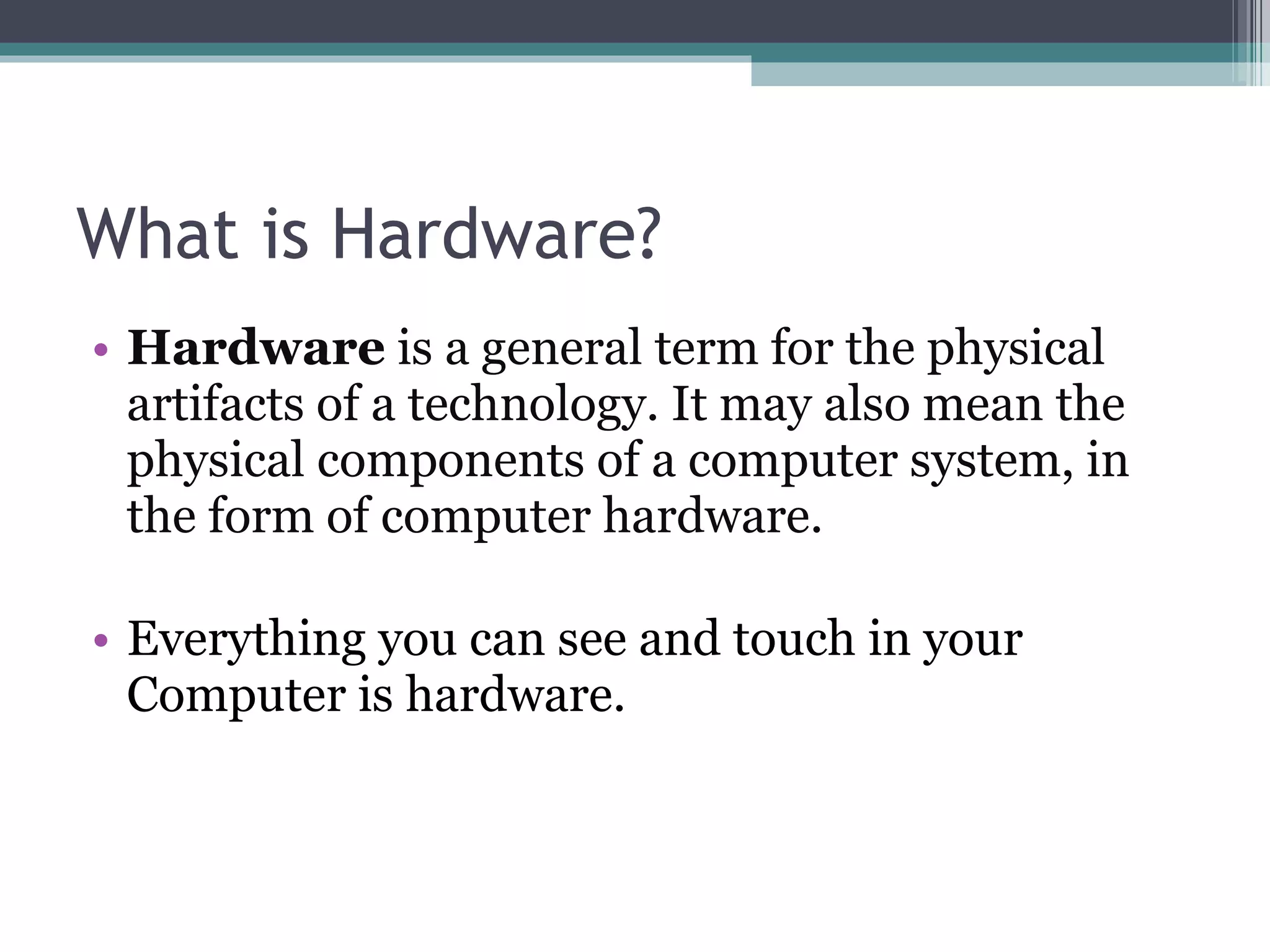 Hardware refers to the physical components of a computer system, including components that can be physically handled like the motherboard, input devices, output devices, storage devices, and memory. Software describes computer programs and includes system software that helps run the hardware, programming software that provides development tools, and application software for specific tasks like business, education, games, and security. Computer hardware and software work together to power all computer functions.