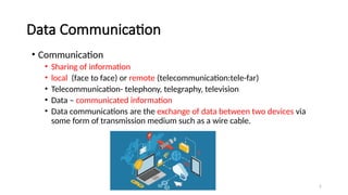 The document outlines the fundamentals of data communications and computer networks, describing key components, data representation, data flow, and network topologies. Characteristics affecting data communication include delivery, accuracy, timeliness, and jitter, while different topologies such as mesh, star, bus, and ring are discussed in terms of their advantages and disadvantages. Additionally, it differentiates between local area networks (LANs) and wide area networks (WANs), highlighting their respective scopes and ownership.