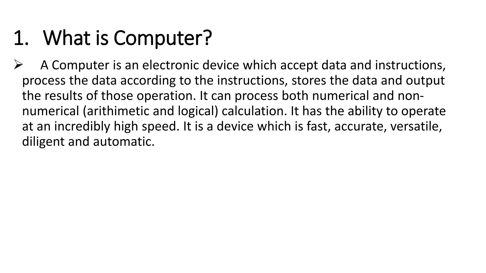 A computer is an electronic device that accepts data as input, processes it according to programmed instructions, stores the output, and can perform both numeric and logical operations at high speeds. Data refers to raw facts and numbers that can be entered into a computer, while information is processed data used to make decisions. Computers are called programmable machines because they can execute prerecorded lists of instructions, or programs. Computers are versatile machines because they can be used to perform different tasks across many fields, solve a wide range of problems simultaneously, and seamlessly switch between uses like calculations, graphics work, and information searching.