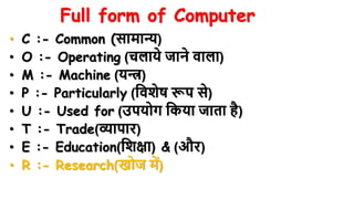1. The document discusses the definition and components of a computer. It defines a computer as an electronic machine that can perform arithmetic and logical operations by taking input, processing it according to instructions, and providing output.