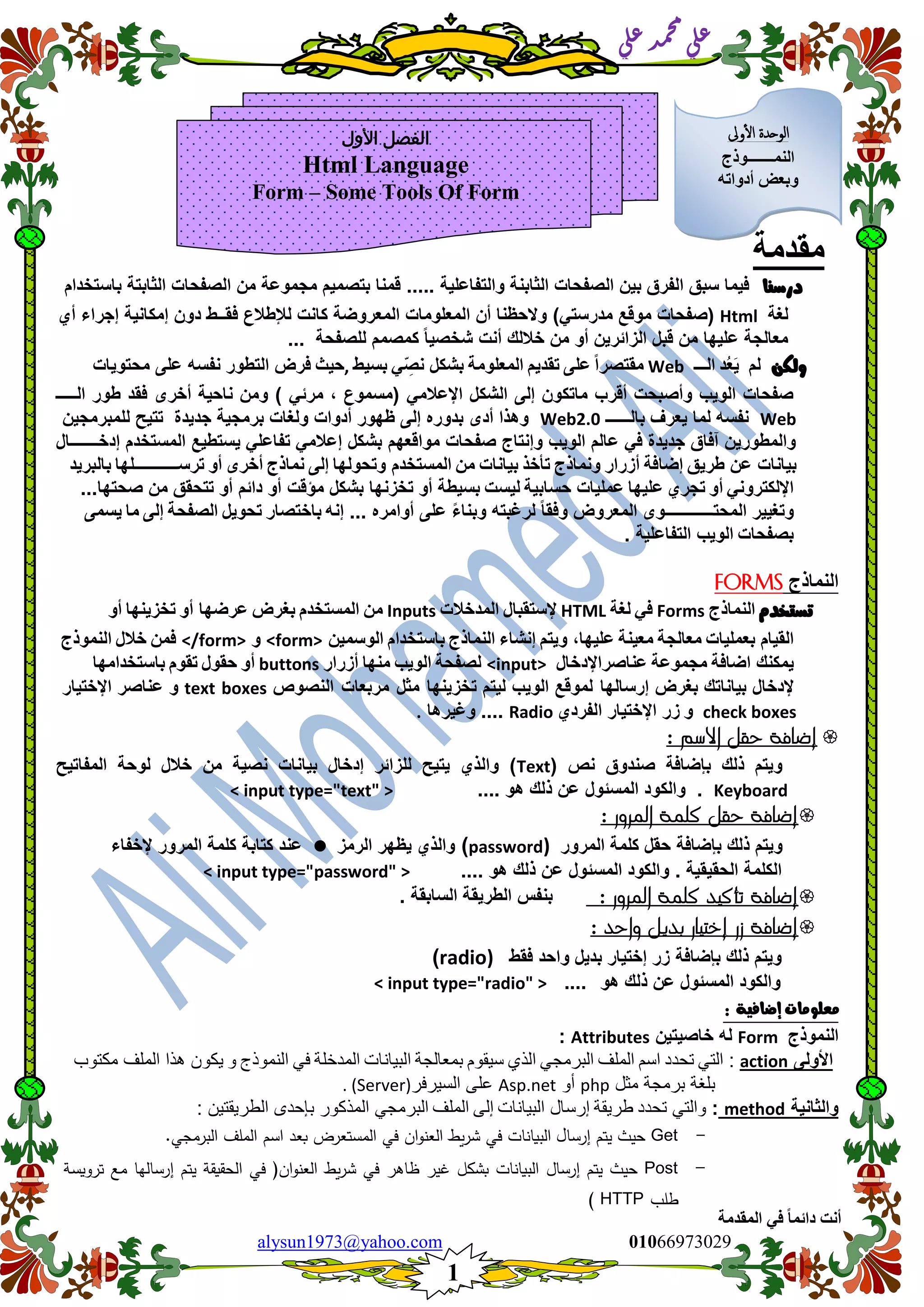 تتناول الوثيقة تصميم وبناء نماذج تفاعلية باستخدام لغة HTML، حيث تشرح كيفية استخدام عناصر الإدخال المختلفة مثل أزرار الاختيار وأزرار الإرسال. توضح الوثيقة أيضًا خصائص النماذج وكيفية معالجة البيانات المدخلة من المستخدم. بالإضافة إلى ذلك، تناقش الوثيقة الأساليب المختلفة لإرسال البيانات إلى السيرفر.