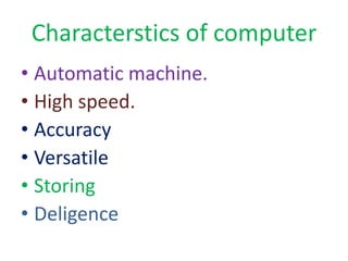 A computer is an electronic device that can perform calculations at high speeds. It processes information based on instructions and can store, retrieve, and process data as needed. Computers have gone through several generations of development. Each generation uses newer technologies that make computers faster, smaller, more powerful, and more affordable. Computers are now widely used both professionally and personally.