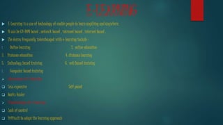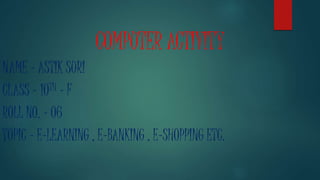 The document summarizes different types of computer activities including e-learning, e-banking, and e-shopping. It discusses e-learning, defining it as using technology to enable learning anywhere. E-learning can be CD-ROM, network, intranet, or internet based. Advantages are lower cost and faster self-paced learning while disadvantages include lack of control and difficulty adopting the approach. E-banking is defined as electronic or online banking, allowing convenient account access and maintenance though security issues exist like hacking and transaction problems.
