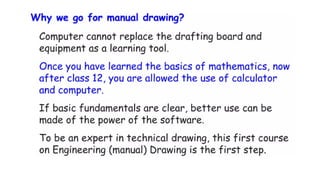 Engineering drawing is the graphic representation of physical objects, utilizing standardized symbols and conventions for universal communication among engineers. A complete engineering drawing should include essential details such as dimensions, materials, and identification specifics, while also following established methods and rules. The course covers visualization techniques, graphics theory, standard practices, tools, and dimensioning necessary for creating accurate engineering drawings.