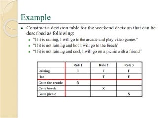 This document discusses computer aided process planning (CAPP). It outlines different CAPP approaches including manual systems, variant systems, and generative systems. It also discusses knowledge based process planning and decision tables, which are a method for representing rules to determine which actions should be taken based on different conditions and condition alternatives. Decision tables are checked for completeness, impossible situations, contradictions, and redundancy.