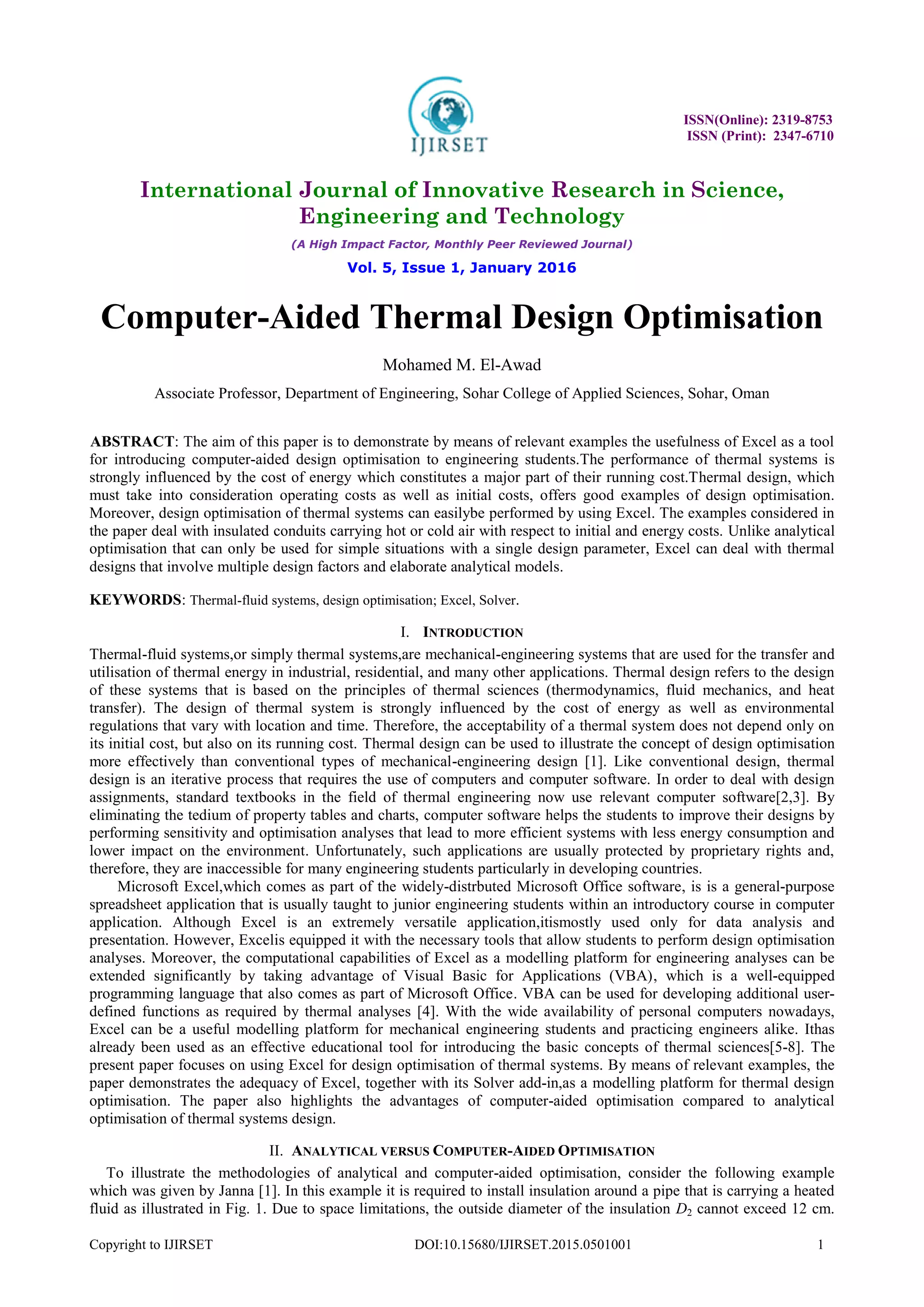 This document describes using Excel to optimize the thermal design of systems. It provides an example of optimizing the insulation thickness and pipe diameter of an insulated pipe to minimize costs. Excel is able to calculate the total cost as a function of diameter and use its Solver tool to iteratively find the optimal diameter that minimizes cost. This provides an effective way for students to learn thermal design optimization compared to analytical optimization, as it can handle multiple design factors and parameters. The document then presents another example of using this approach to optimize the diameters and insulation thicknesses of two sections of an air conditioning duct to minimize owning costs.