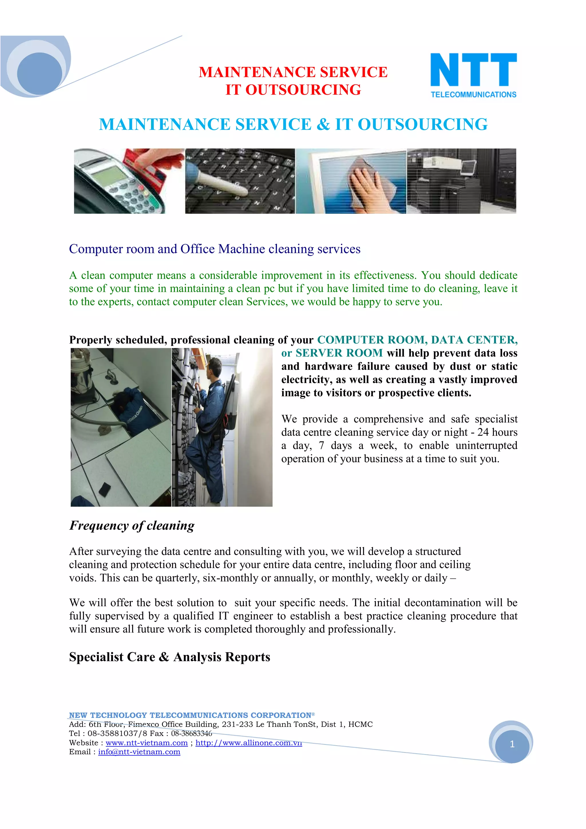 This document discusses maintenance and IT outsourcing services including computer room cleaning, PC cleaning, keyboard and mouse cleaning, monitor cleaning, and telephone cleaning. Specialized cleaning helps prevent hardware failure from dust and improves safety. Technicians are trained to clean equipment without damage using anti-static products. Regular cleaning boosts productivity by reducing bacteria and improving the working environment.