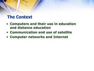 The document discusses the impact of computer and communication networks in education, particularly emphasizing their role in distance education through satellite communication and teleconferencing. It highlights various systems and tools for online learning, such as Learning Management Systems (LMS) like Blackboard and Moodle, while addressing challenges like poor interaction and presentation quality. Overall, it asserts that effective ICT use can enhance the quality of both traditional and distance education.