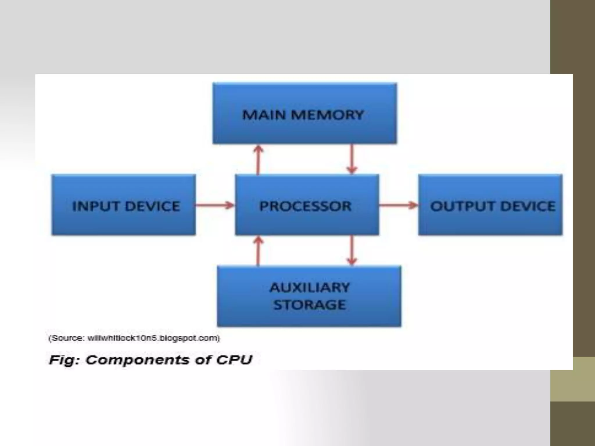 - The central processing unit (CPU) controls all other parts and processes data according to programmed instructions at high speeds. Memory, including the primary random access memory (RAM) and secondary hard disks, allows data and programs to be stored and retrieved.