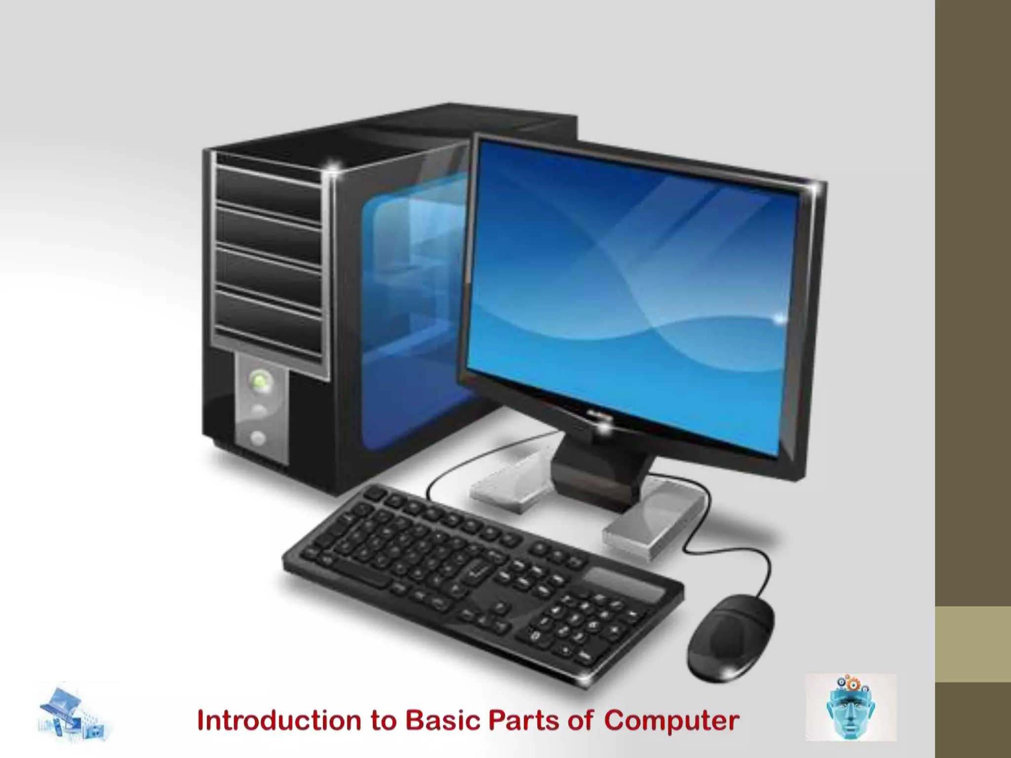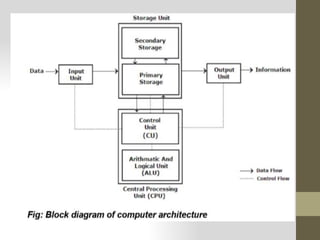 The document discusses the basic parts of a computer and their functions: