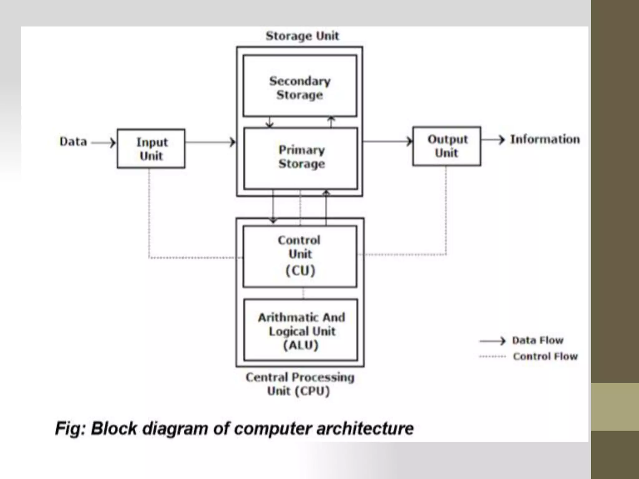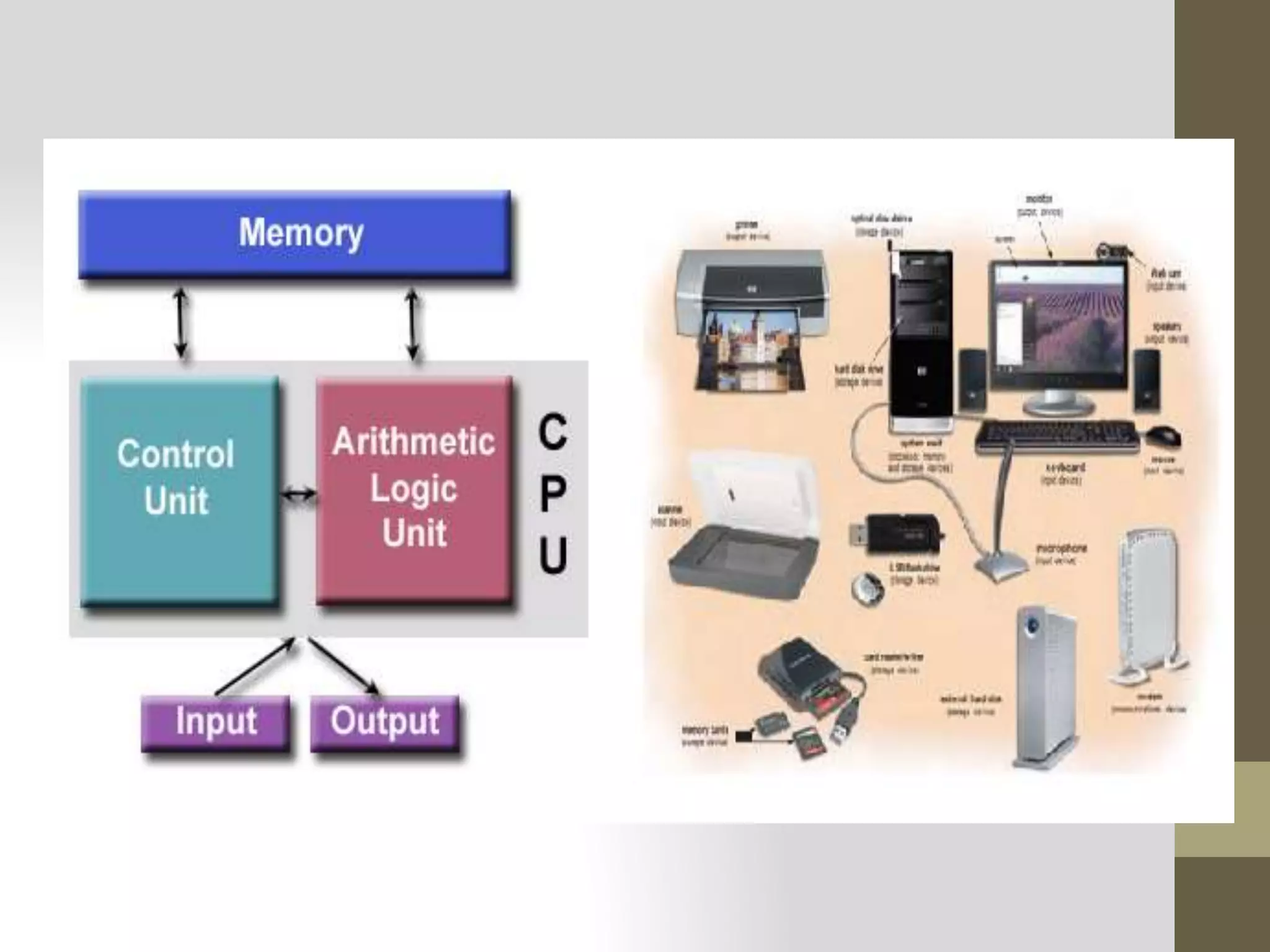 - The input unit includes keyboards, mice and microphones which allow data and instructions to enter the computer. The output unit includes monitors, printers and speakers which present the computer's processed results.
