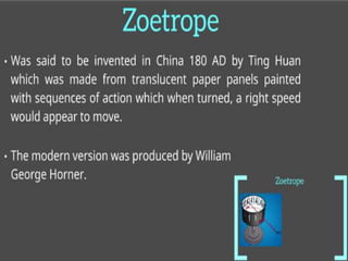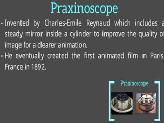 Animation is a technique used to simulate movement by displaying a series of pictures or frames. There are many tools available to help create animation, from traditional hand-drawn animation to 3D computer graphics software. Current trends in animation include the use of 3D modeling and effects in both television and films to create more realistic movements and environments.